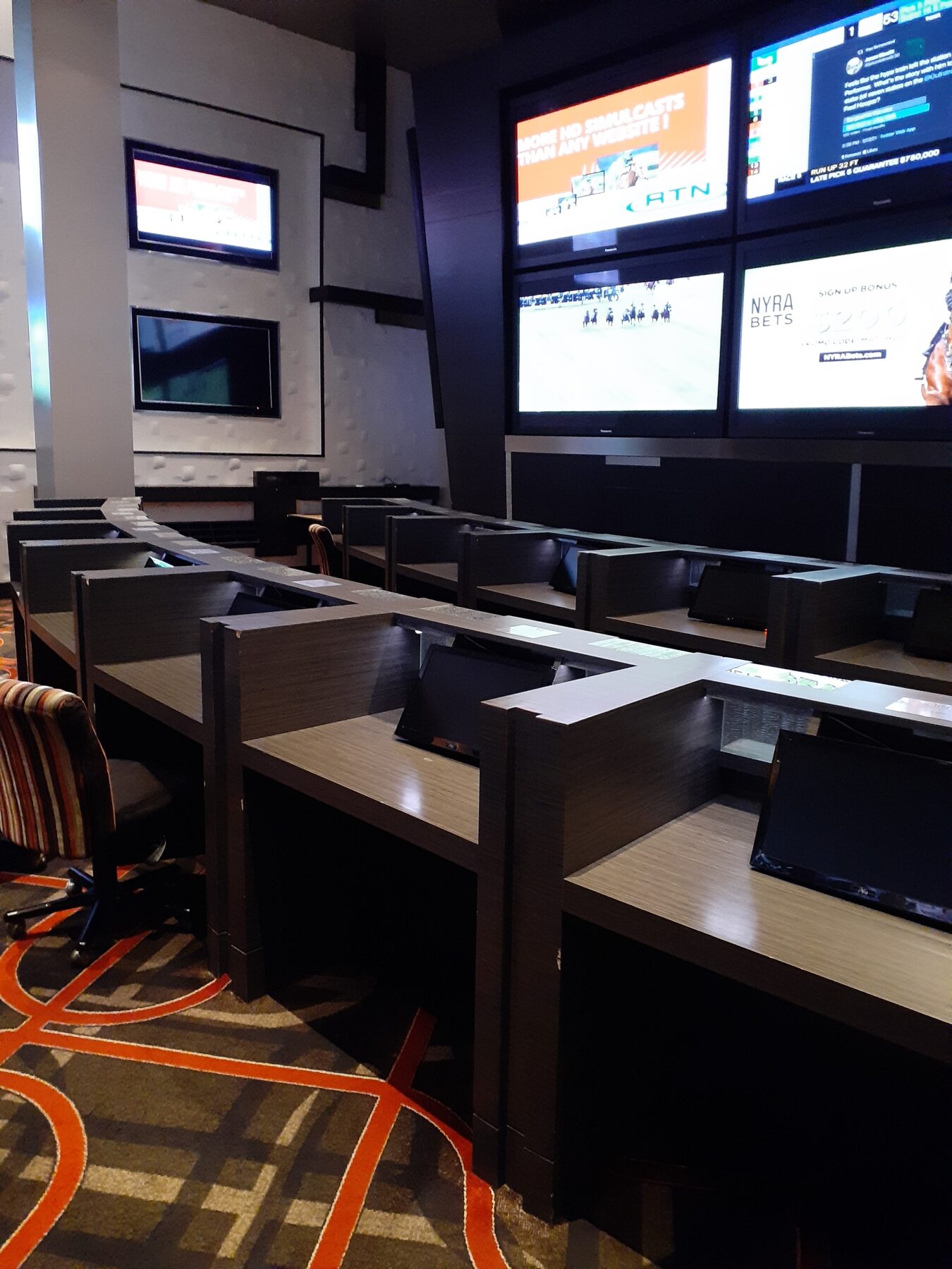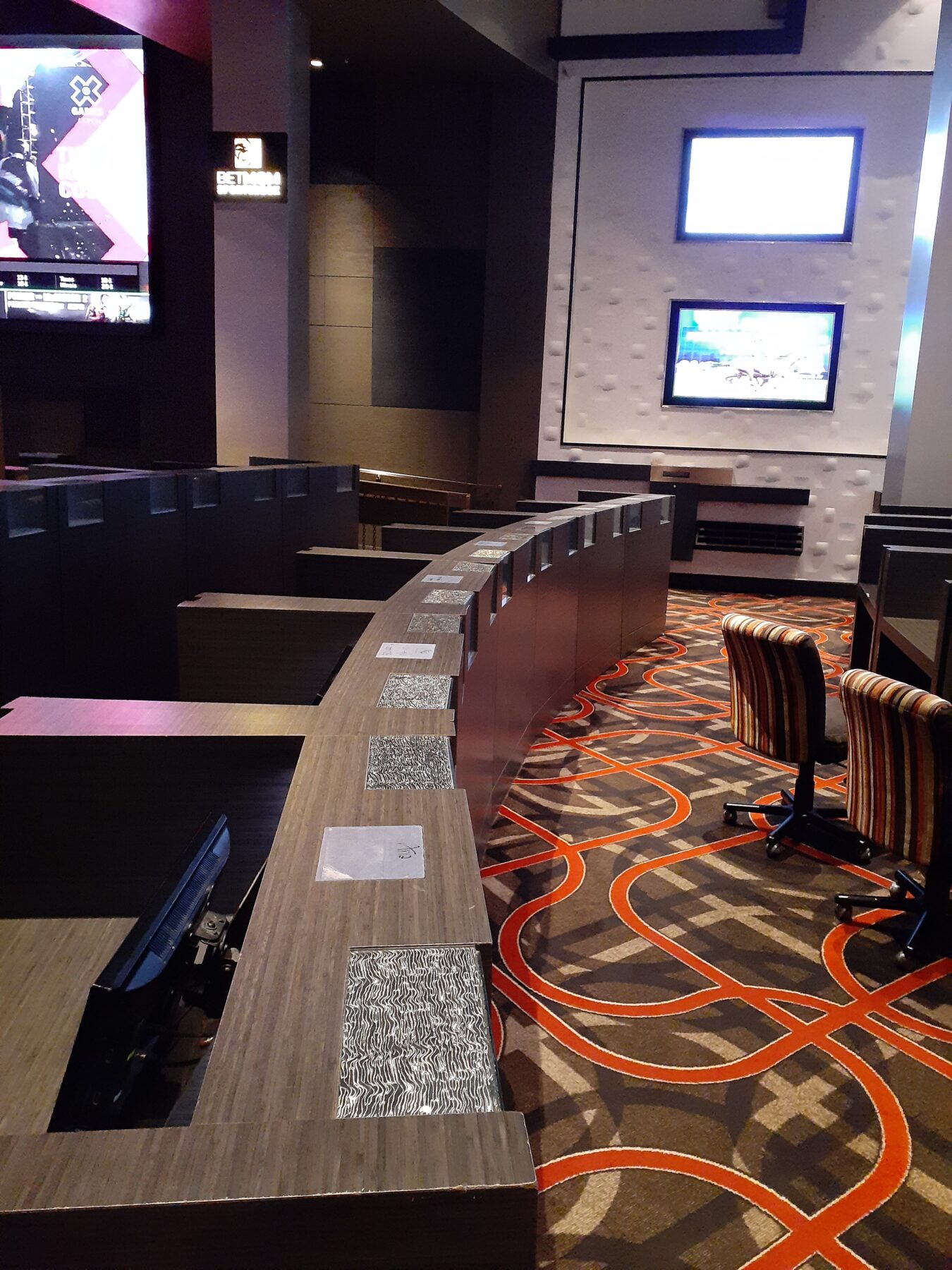 The sportsbook features a compartmentalized layout that feels more intimate than many large Las Vegas sportsbooks. Seating is divided between lounge-style areas for small groups and desk-style seating designed specifically for horse bettors, complete with individual monitors. VIP seating areas include plush armchairs and couches, with most tables limited to six guests, which helps preserve space and reduce crowding. The sportsbook is tucked into the interior of the casino, offering a quieter setting compared to open-floor sportsbook designs.