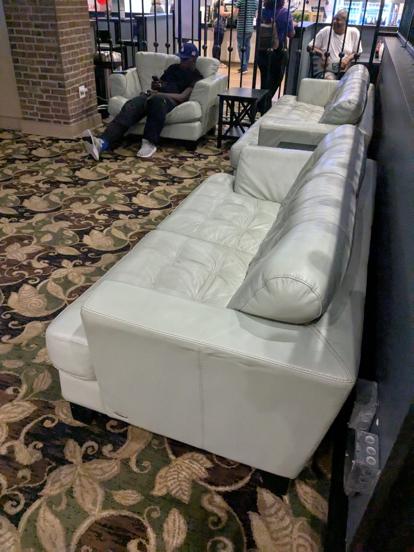 Seating is scattered and inconsistent, with a mix of individual chairs, small high-top tables for two, and a handful of couches. Some seating is oversized and comfortable, but the furnishings feel mismatched and dated. The layout is disjointed, with seating spread across multiple zones that do not all share a clear sightline to the main viewing areas. The space feels more like a casual hangout than a purpose-built sportsbook.