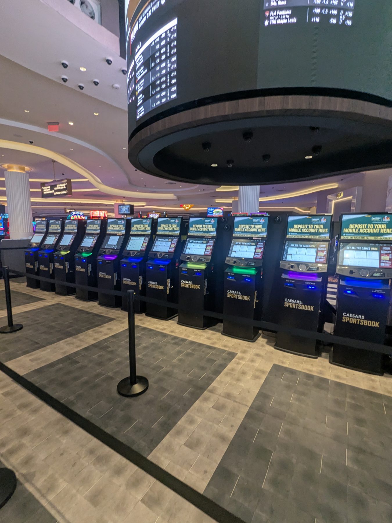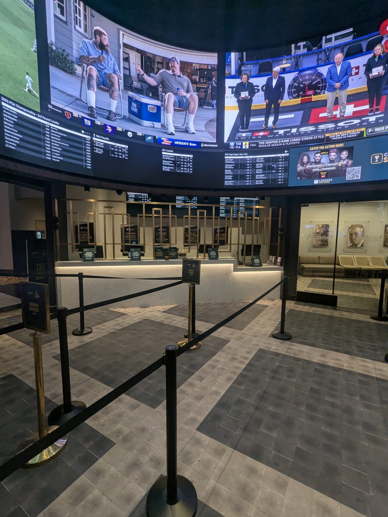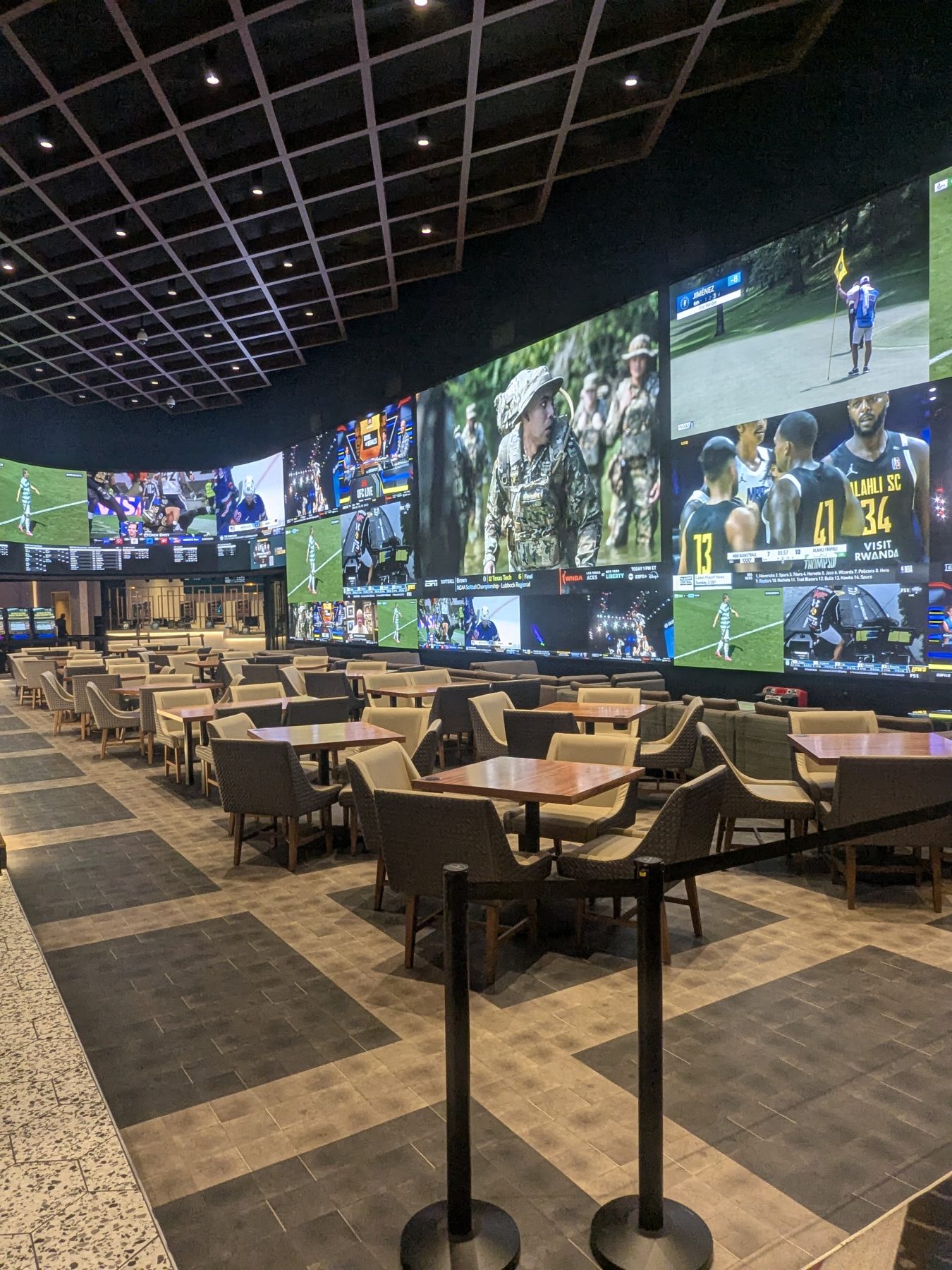 A massive 147-foot video wall serves as the centerpiece of the sportsbook, providing clear, high-definition coverage of multiple games simultaneously. Additional displays are strategically positioned to ensure nearly every seat has a good view. The combination of screen size, resolution, and layout offers one of the most immersive viewing experiences available in regional sportsbooks.