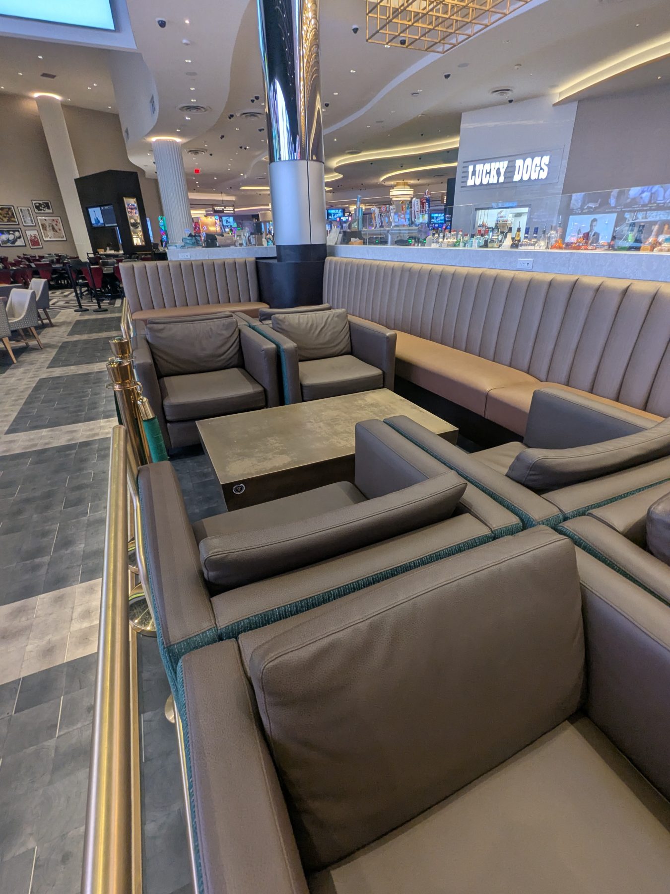 Food service is integrated with the casino’s Food Hall, allowing guests to place orders via a QR code from any connected restaurant. Wait staff deliver meals to both groups and individual guests, ensuring convenience without interrupting the viewing experience. A large bar with video poker is located inside the sportsbook, providing drinks and casual dining options.