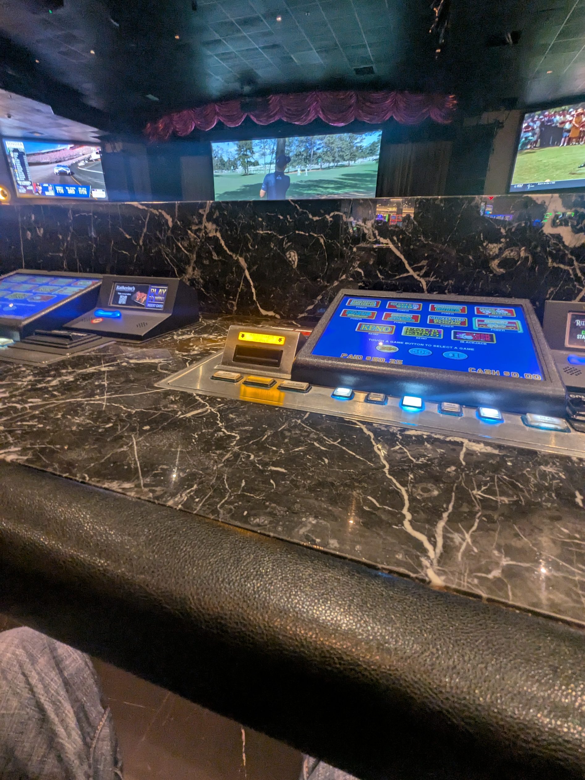 A large projector screen serves as the main focal point of the sportsbook. While the image quality is not as sharp as modern LED video walls, it is sufficient for following games and events. Additional televisions are positioned throughout the room, providing consistent coverage and allowing guests to view games from most seating areas.