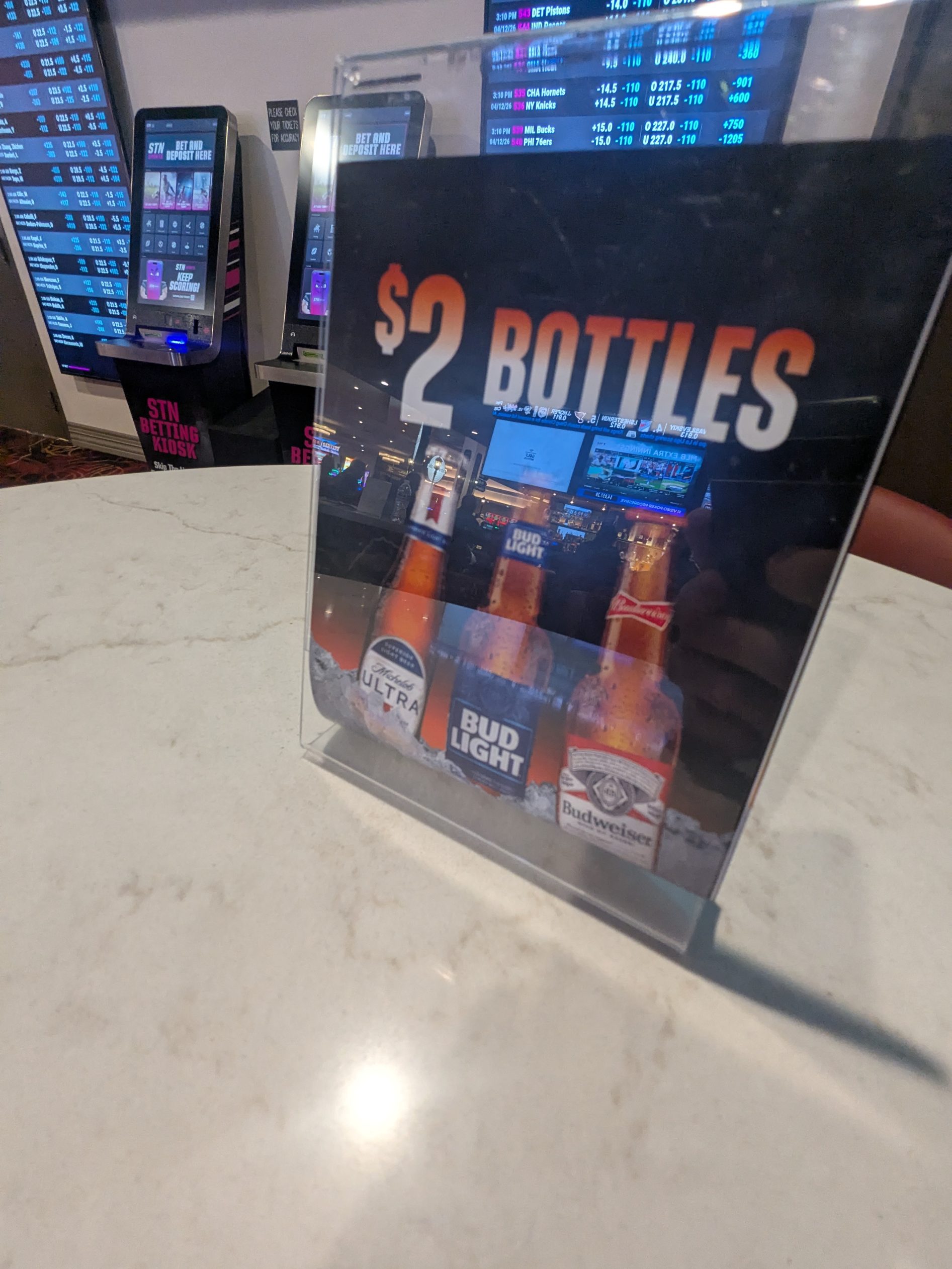 There are no dedicated food options located within the sportsbook itself. However, CasaBlanca offers multiple dining options within the casino, all within a short walk of the sportsbook. The bar area inside the sportsbook provides drinks, but guests looking for meals will need to visit nearby restaurants.