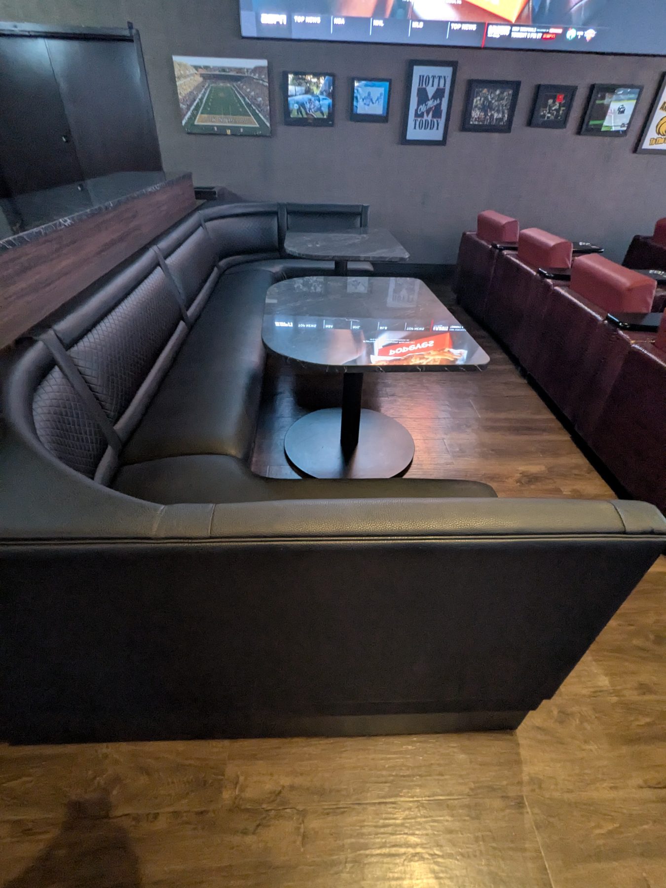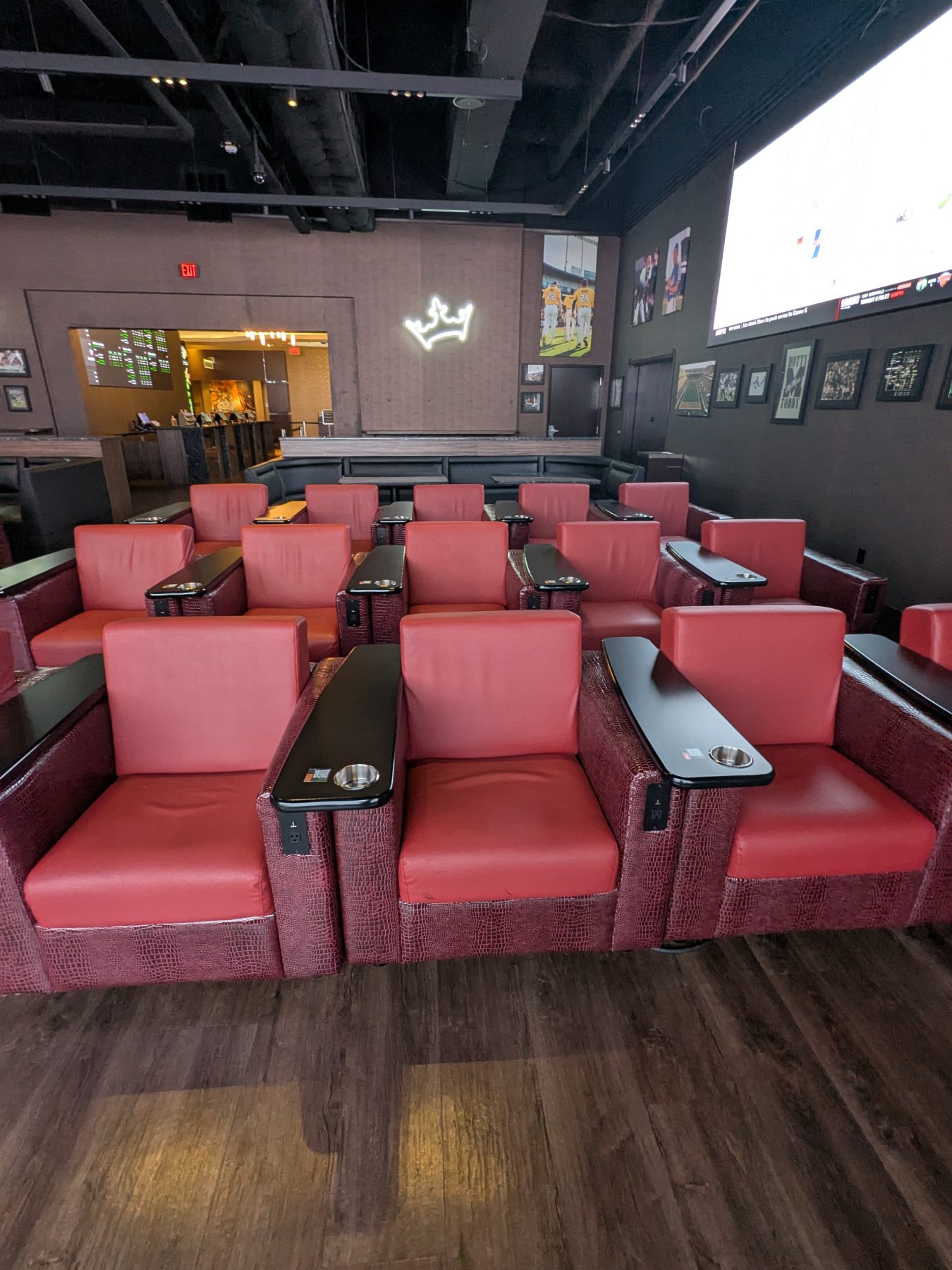 The sportsbook is tucked away from the main casino floor, providing a private, focused environment. Seating includes approximately 40–50 individual chairs with cupholders and affixed desks, along with VIP booths that accommodate 6–8 guests each. High-back chairs and lounge-style seating provide comfort for extended game sessions. During peak times, such as NFL Sundays, reservations are highly recommended. General seating operates on a first-come, first-served basis on quieter days.