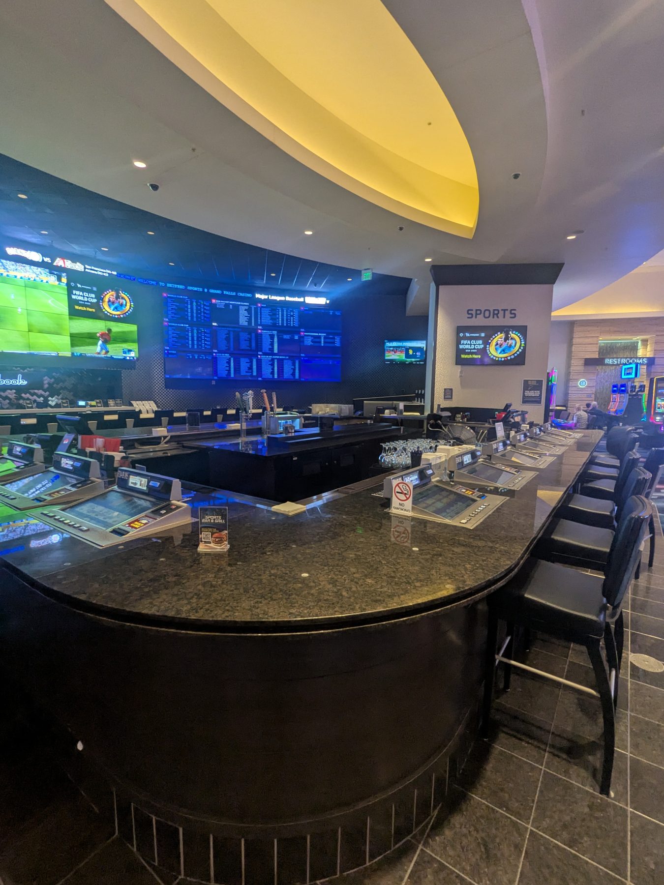 The sportsbook combines leather chairs, high-top tables, and private seating with a modern layout that supports both individual bettors and groups. The open, well-organized floor plan allows for easy navigation and access to wagering stations.