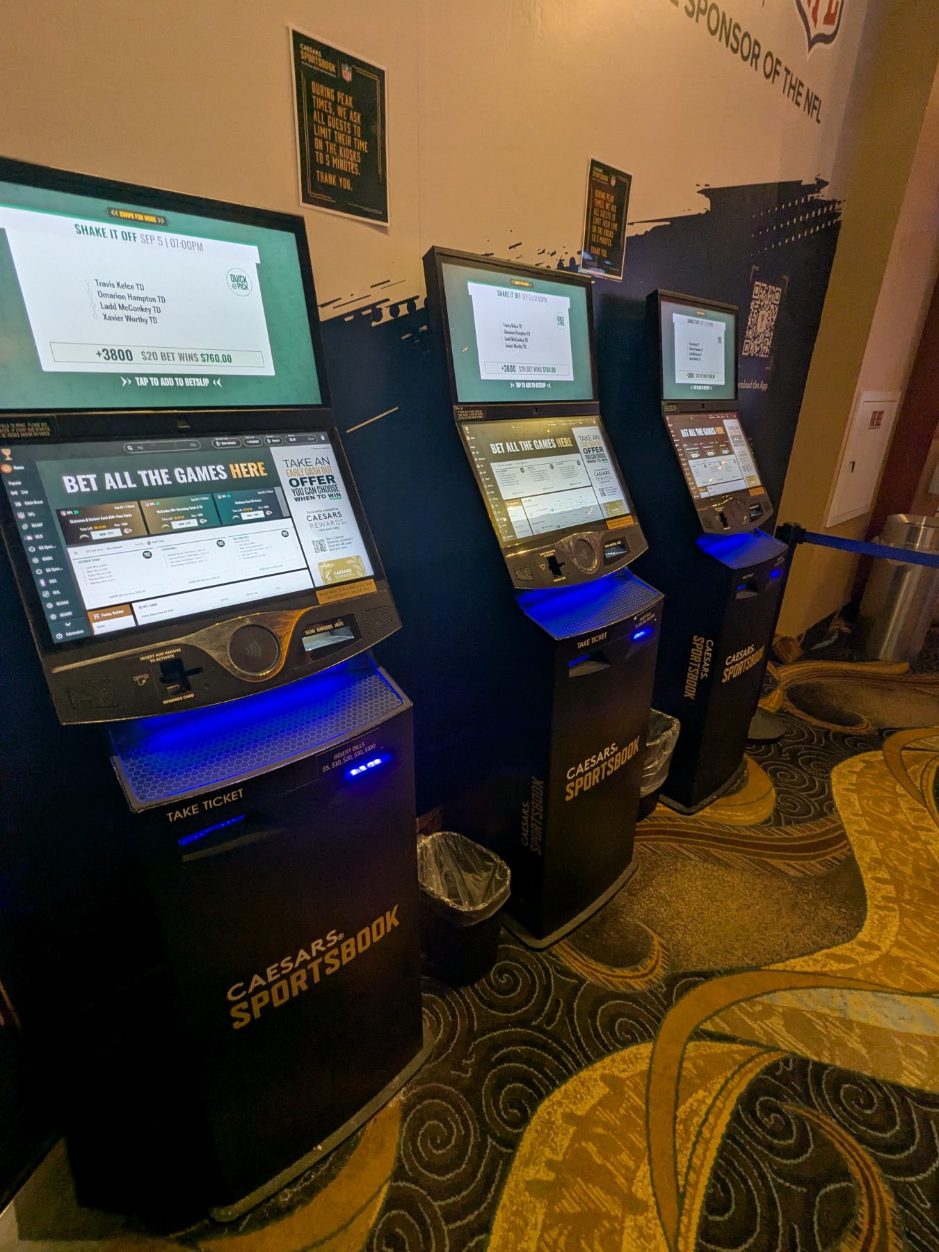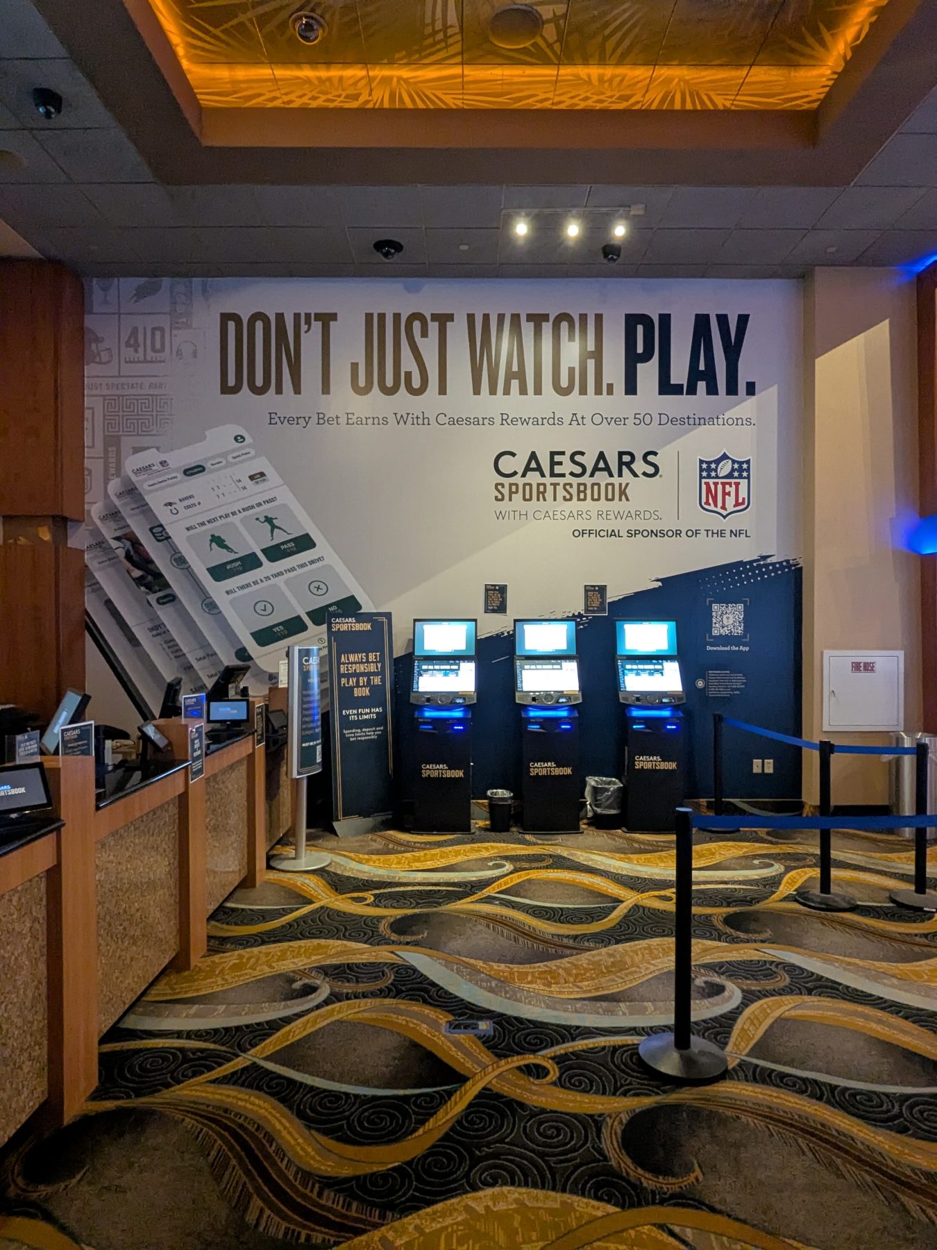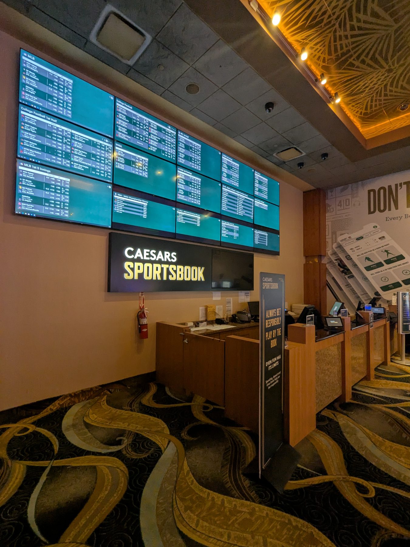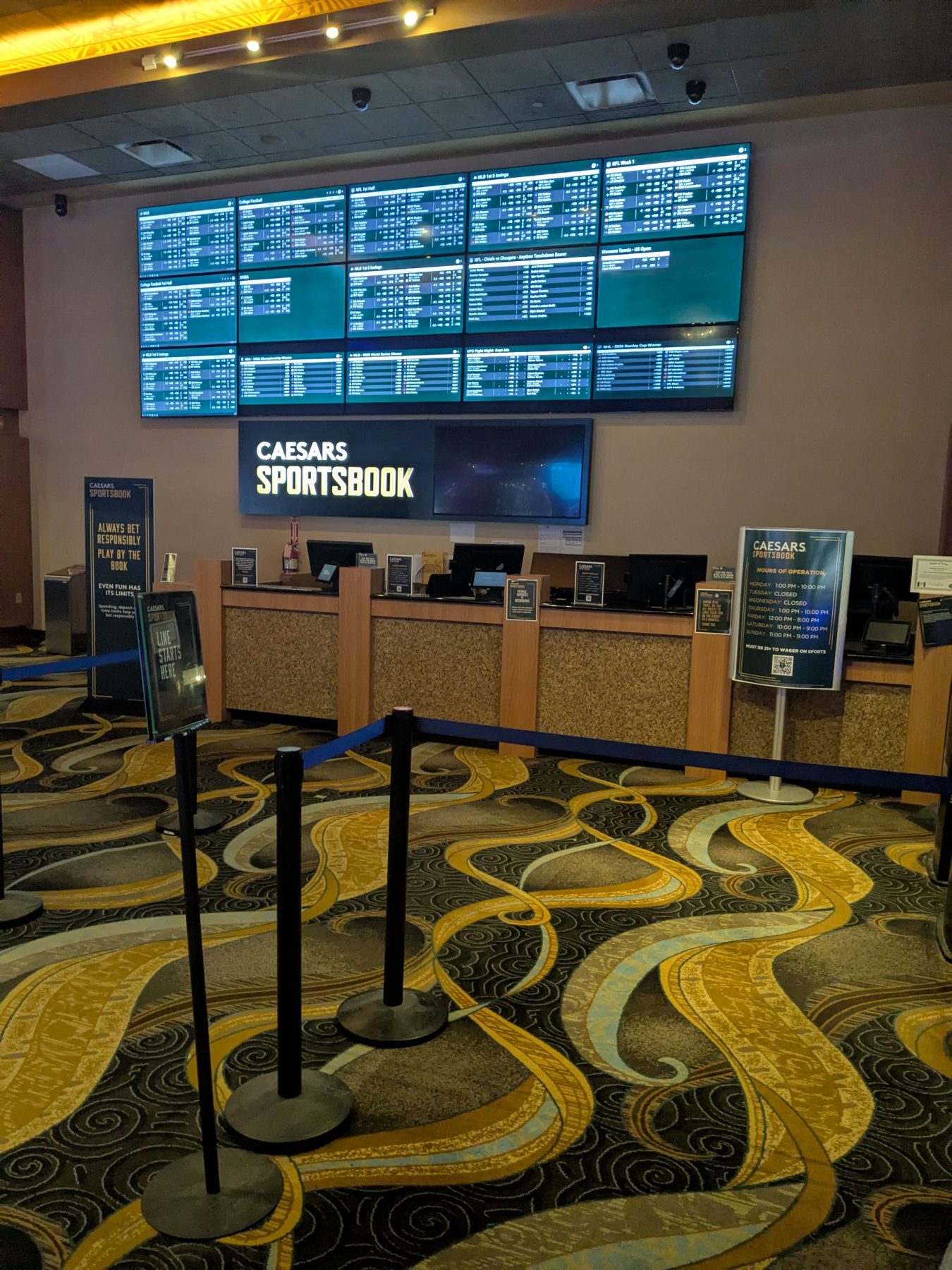 There is no dedicated food or drink service within the sportsbook itself. Casino dining is available nearby, and complimentary soft drinks are offered in the casino, allowing guests to stay refreshed while placing bets.
