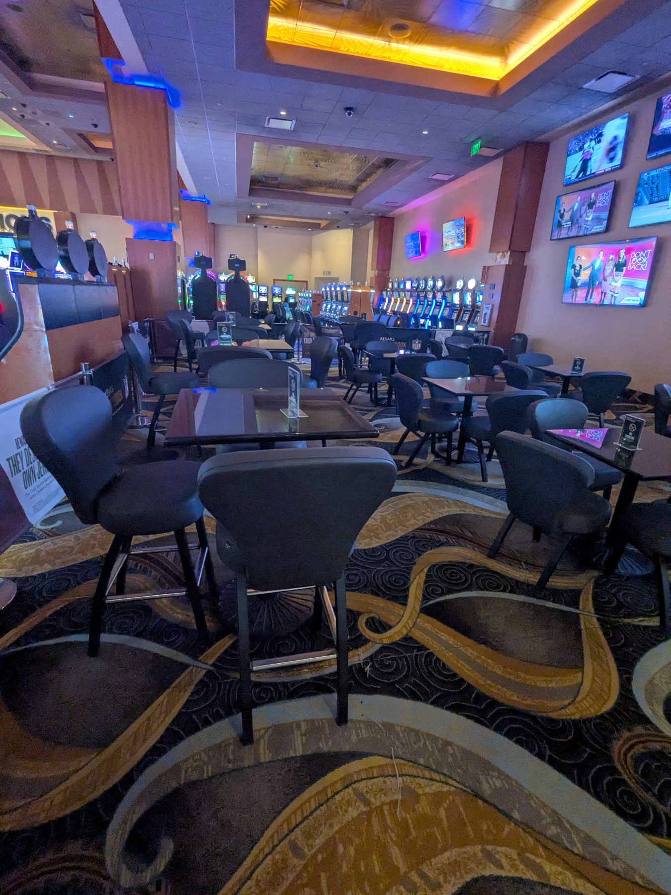Seating consists entirely of tables and chairs, with no couches, recliners, or lounge areas. The layout is open to the main casino floor, which makes the space feel less private and limits its appeal for extended stays or social gatherings.