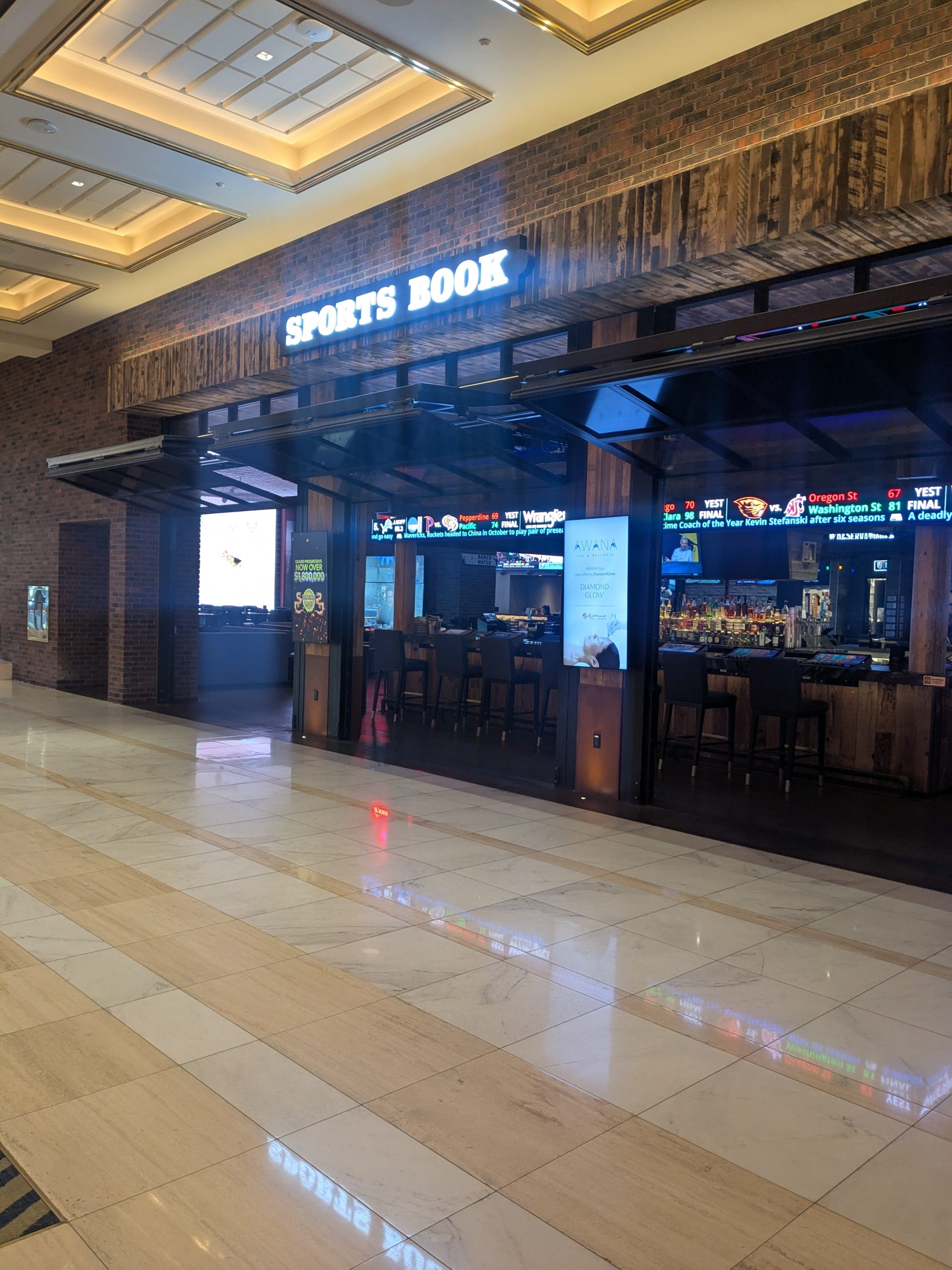 The sportsbook does not feature dedicated betting desks or a horse racing viewing area, reinforcing its focus on general sports betting rather than traditional racing audiences. Both betting windows and self-service kiosks are available and are easy to access within the space.