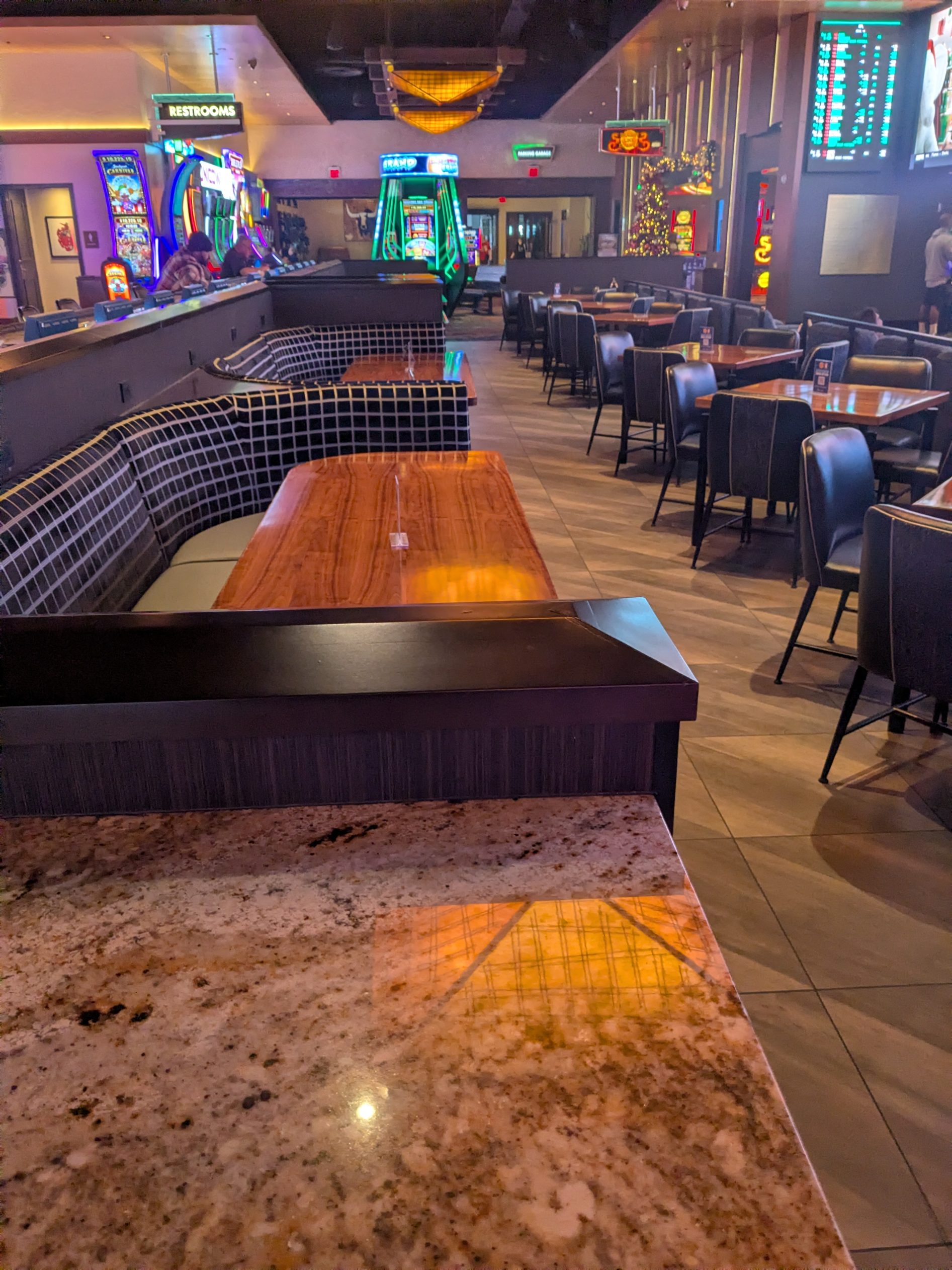 At roughly 1,600 square feet, the sportsbook is compact but thoughtfully designed. Seating options include lounge chairs, four-person tables, six-person booths, and bar-top seating with video poker. The booths provide a semi-private experience ideal for small groups, while ADA-accessible options are available throughout. The layout balances functionality and comfort, creating a manageable, organized environment even when the casino floor is busy.