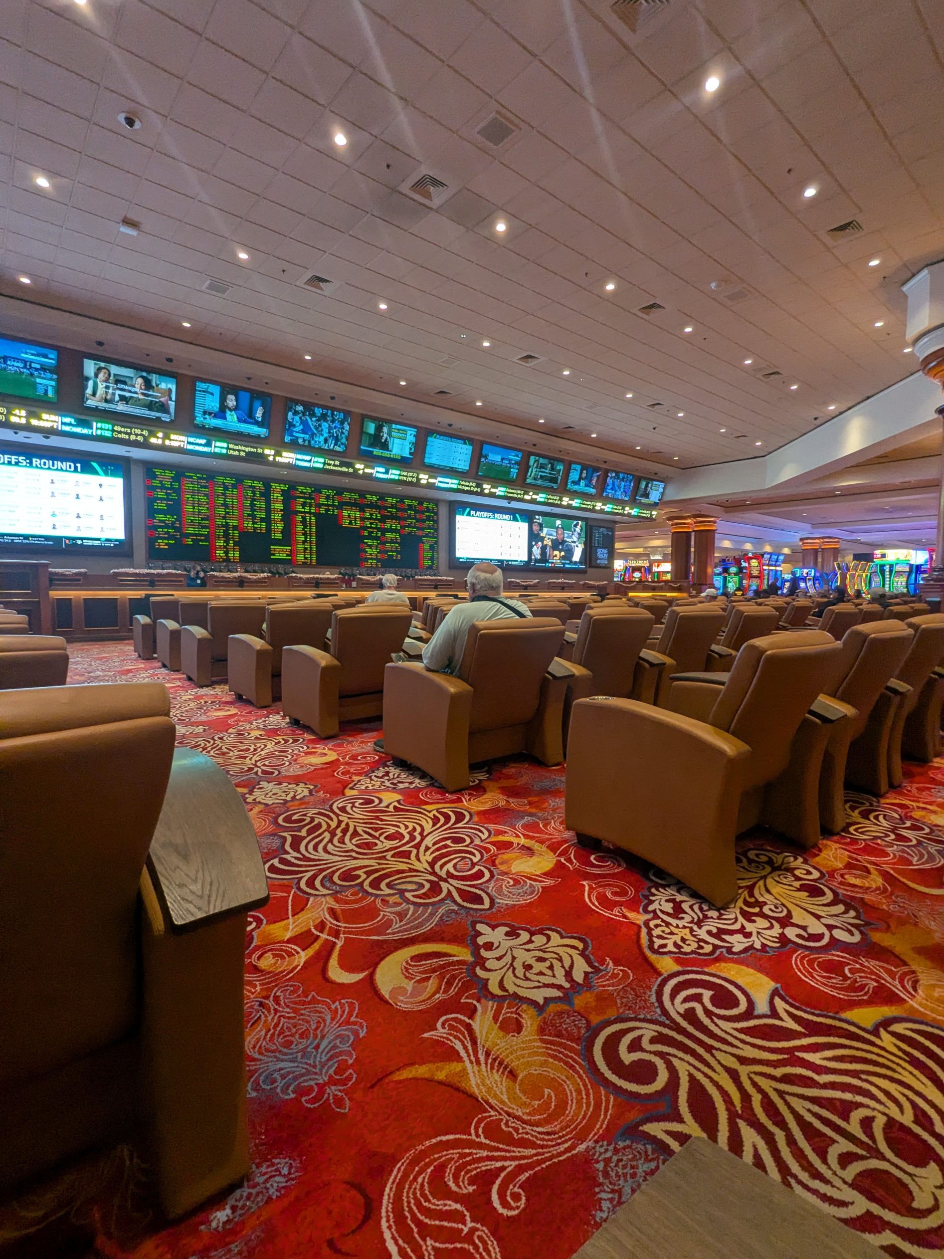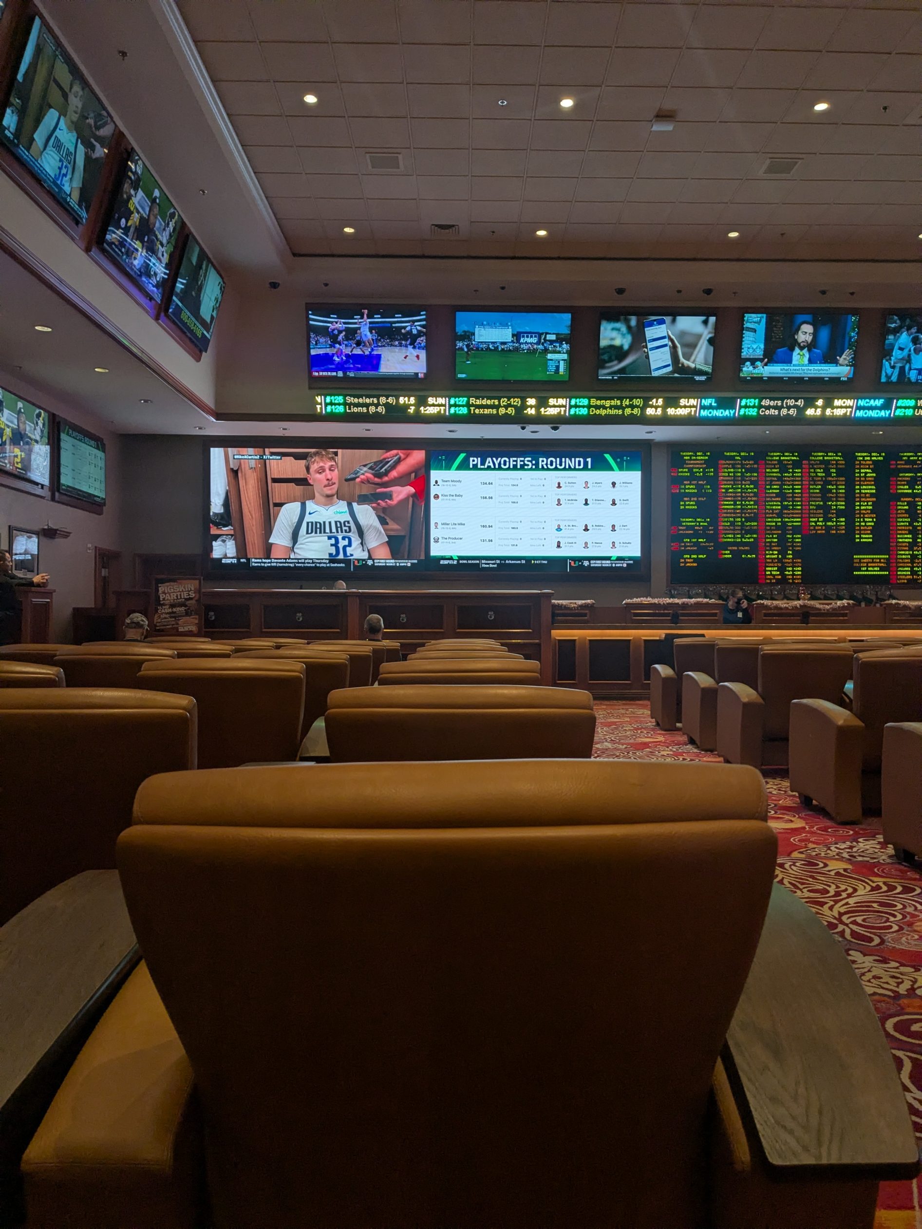 The sportsbook features two large wall-sized screens and multiple plasma TVs dispersed throughout the room. The visual setup provides good coverage for major sports, offering clear sightlines from most seats. While the screens aren’t the largest in Las Vegas, they are more than adequate for following multiple games at once.