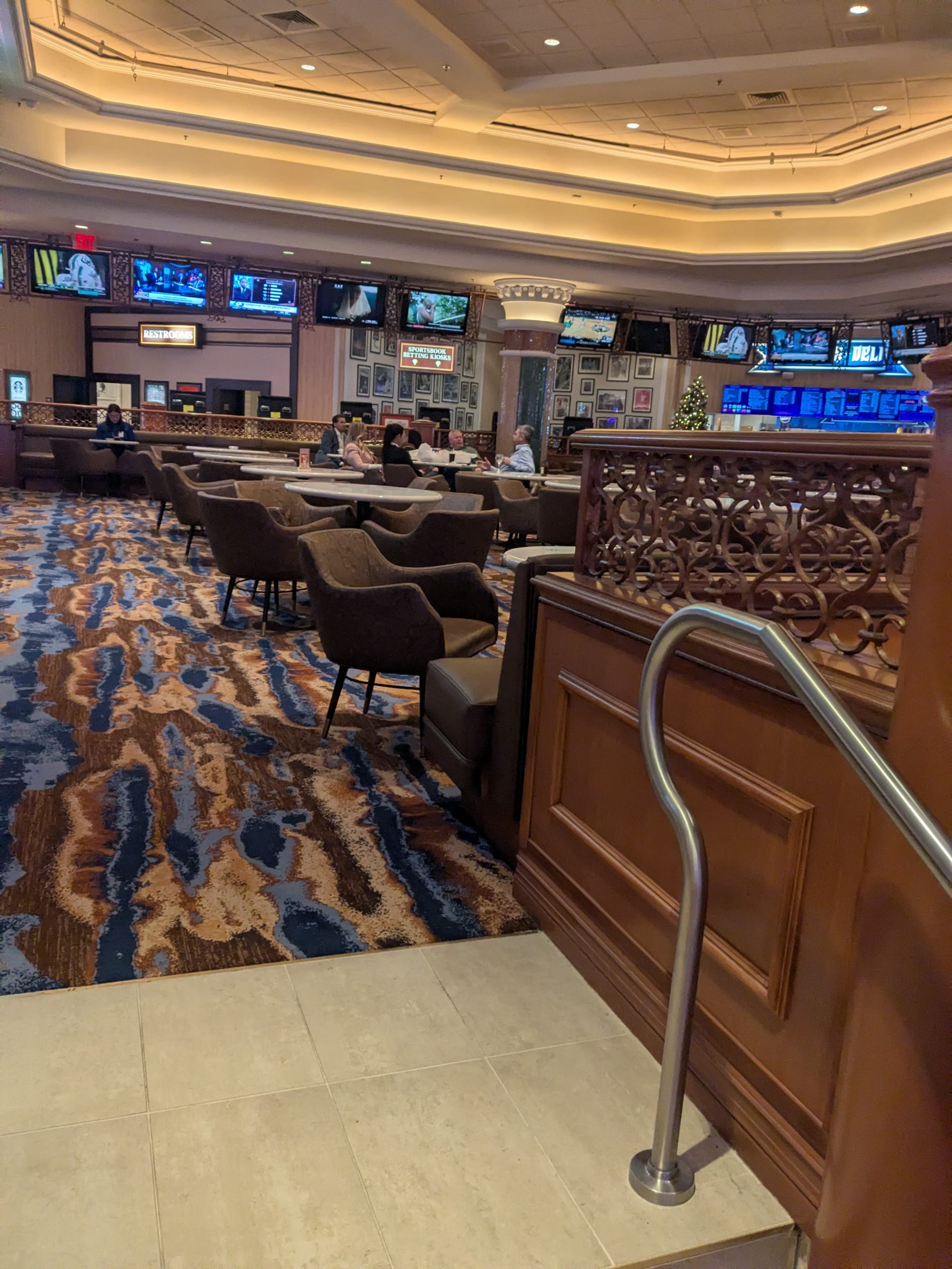 Seating is abundant and fully open, consisting of standard sportsbook chairs arranged throughout a large room. There are no couches, private booths, or VIP sections, making it easy for solo bettors to find a spot. Large groups can use the connected Del Mar Deli seating to sit together, though casual group arrangements may be more limited. The layout prioritizes accessibility and straightforward viewing rather than upscale lounging.