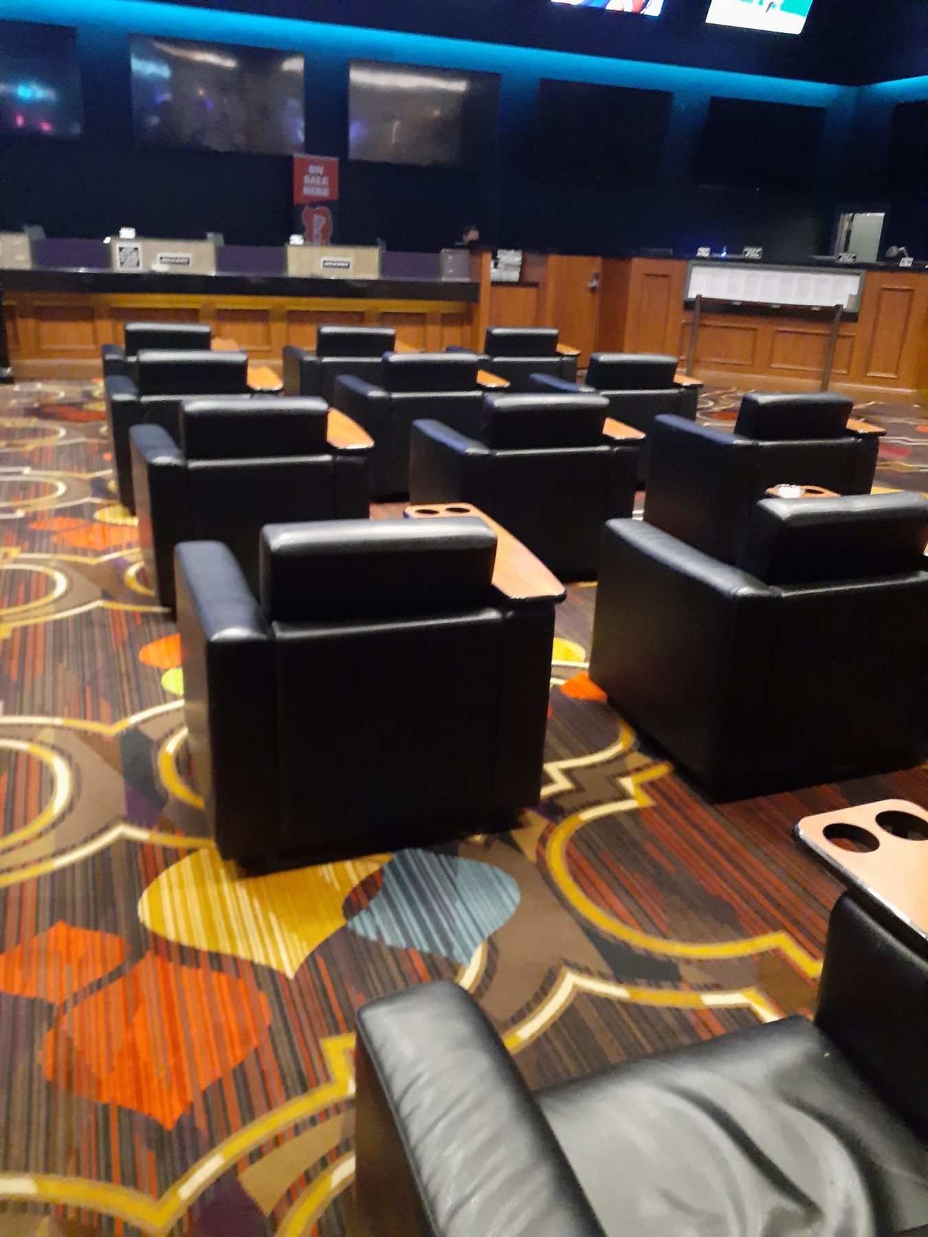 Reservations are accepted for the individual desk seats, which are ideal for horseplayers and regular bettors. Oversized chairs and open seating remain first-come, first-served. For peak times or special events, contacting the casino directly to reserve desk seats is recommended.