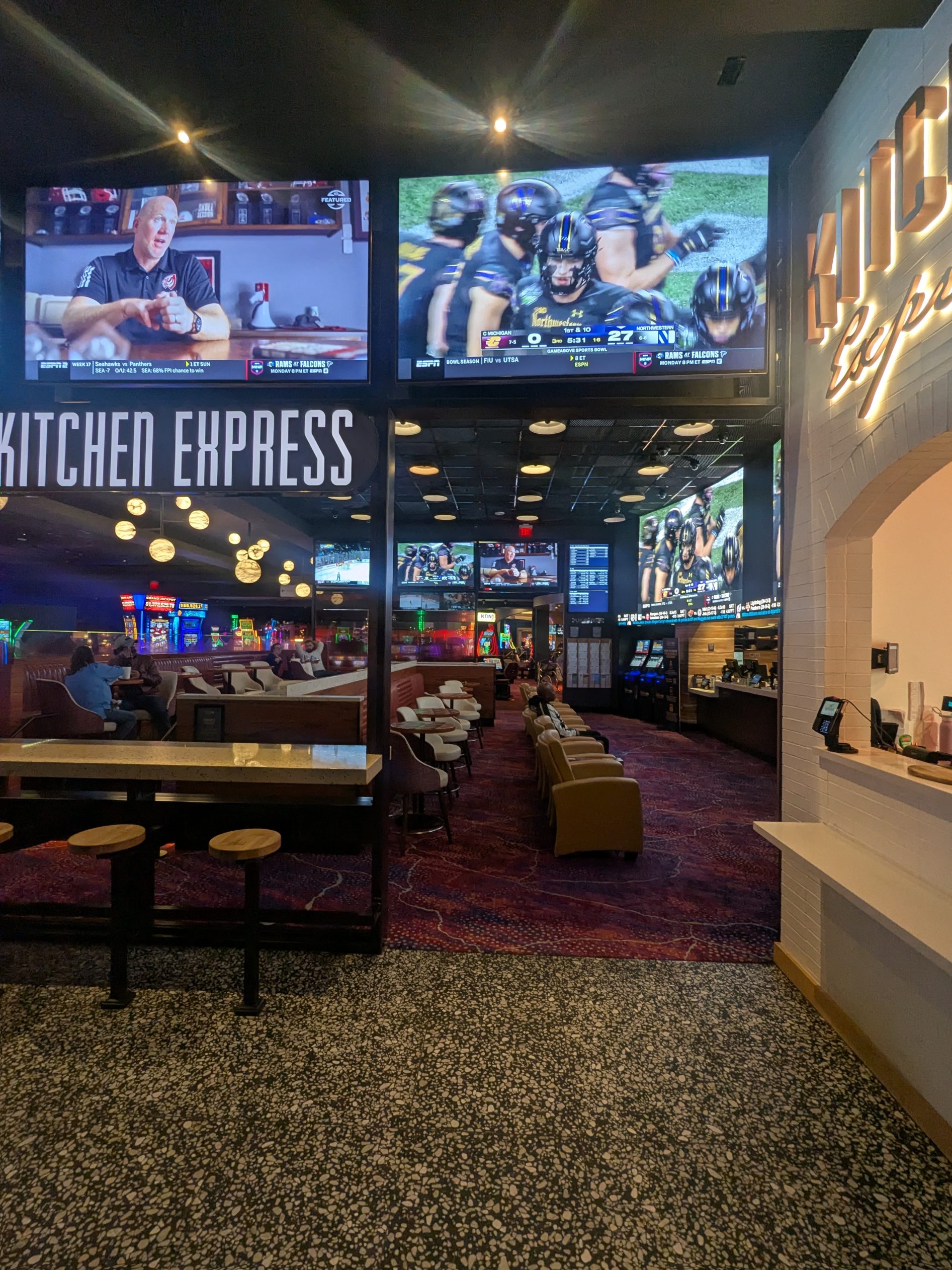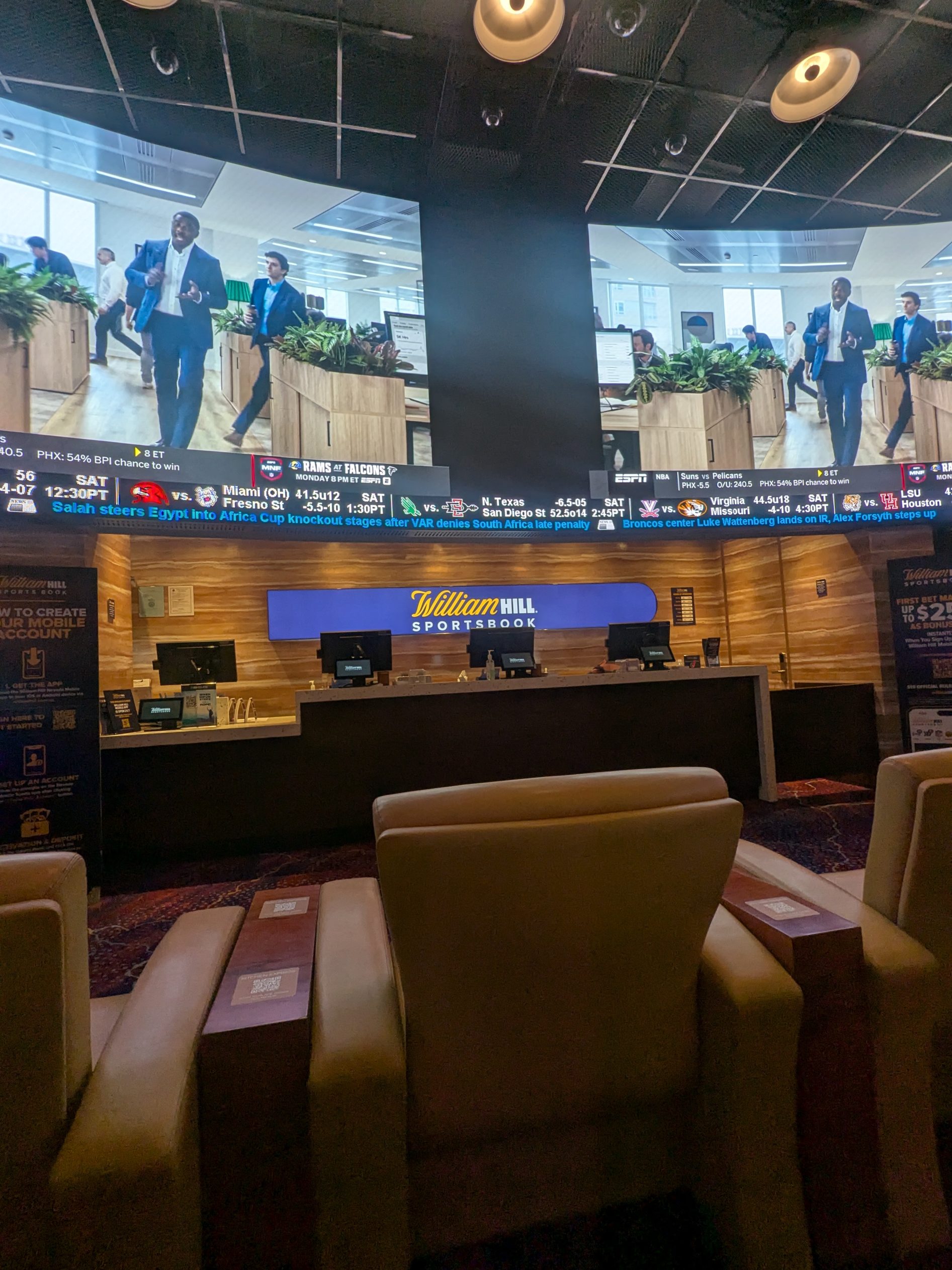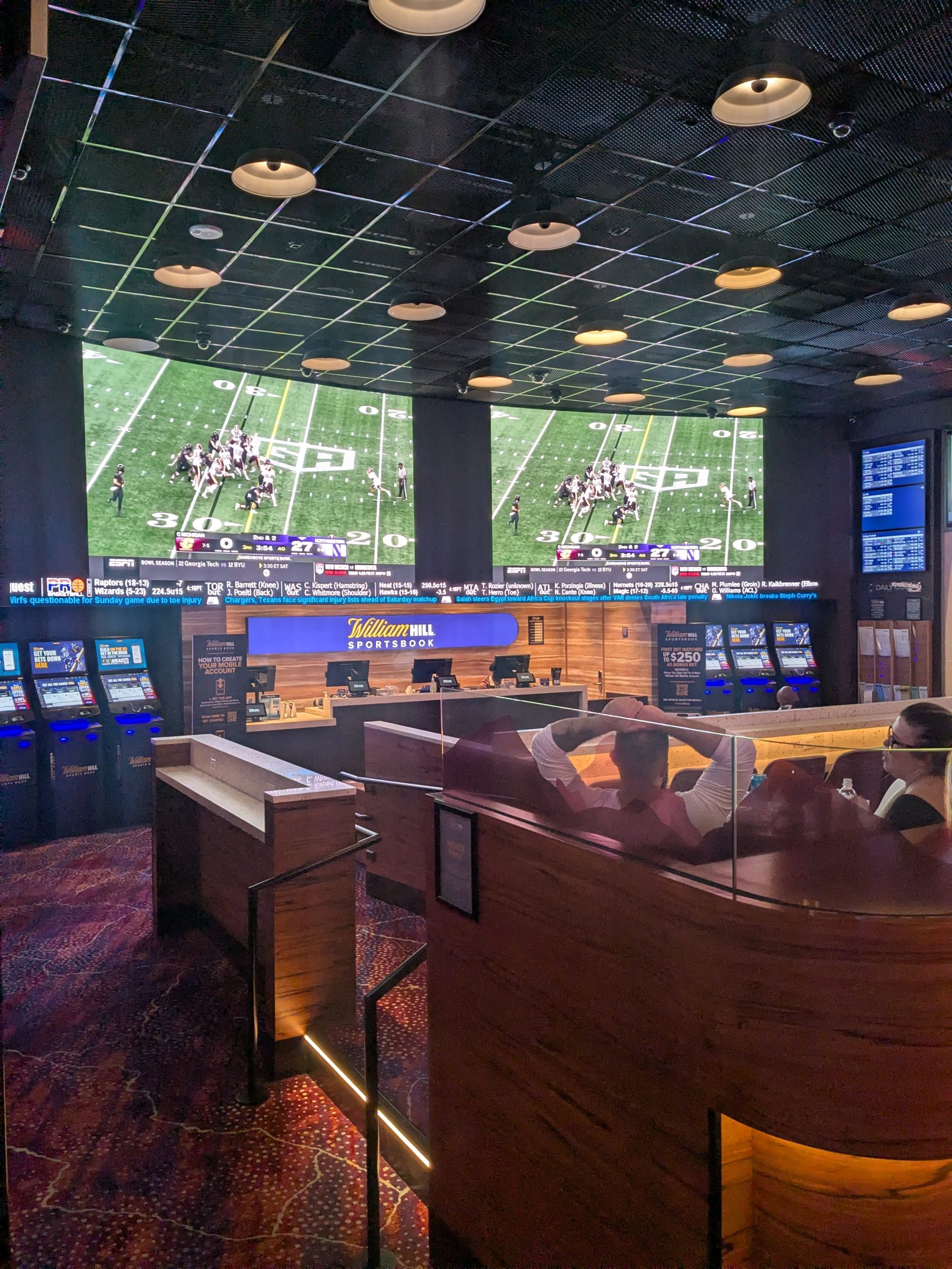 A central video wall anchors the sportsbook and provides clear viewing for multiple games at once. While it is not among the largest video walls in Las Vegas, it is well proportioned for the size of the space and delivers a strong viewing experience. Additional flat-screen TVs line the sides, and scrolling sports tickers display live scores and updates throughout the day.