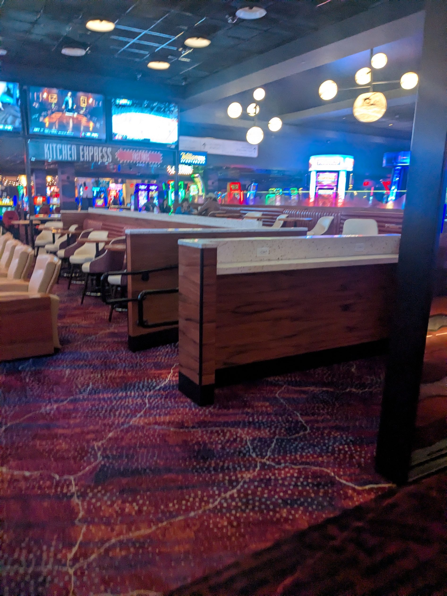 The sportsbook is relatively small and not fully enclosed, but its design gives it a distinct footprint within the casino. Seating emphasizes comfort and shared viewing rather than individual betting stations or traditional race-focused setups.