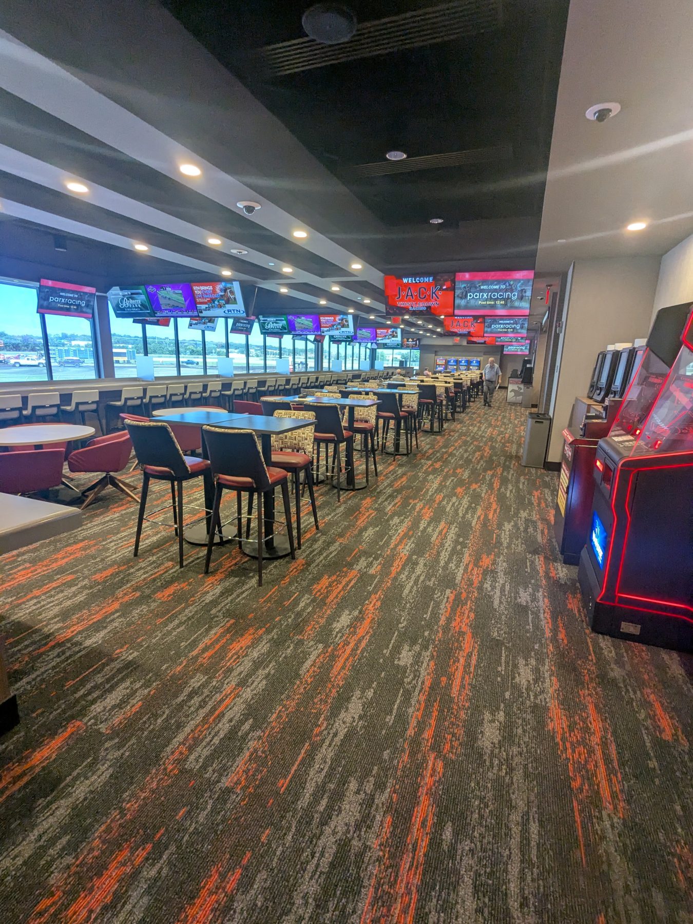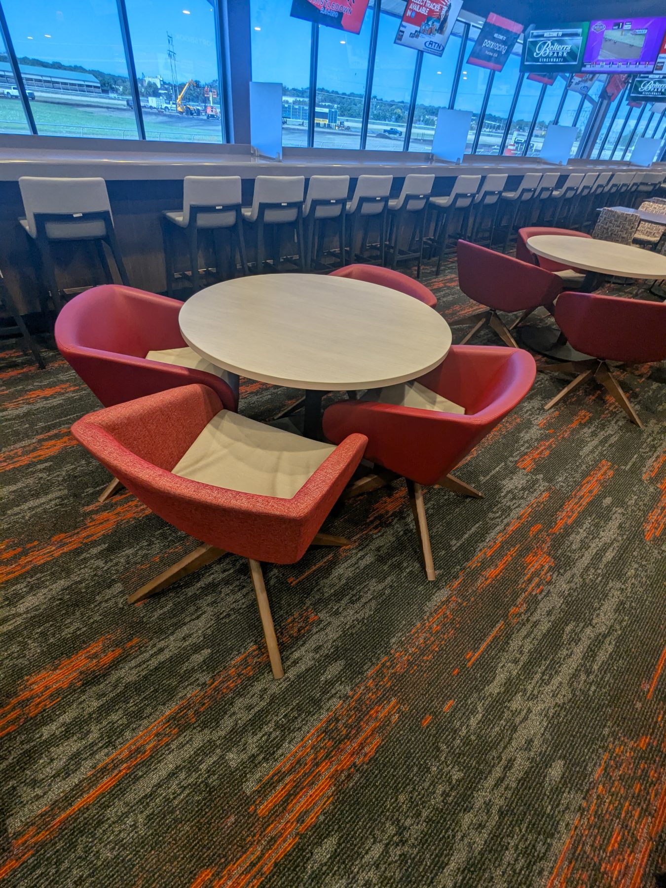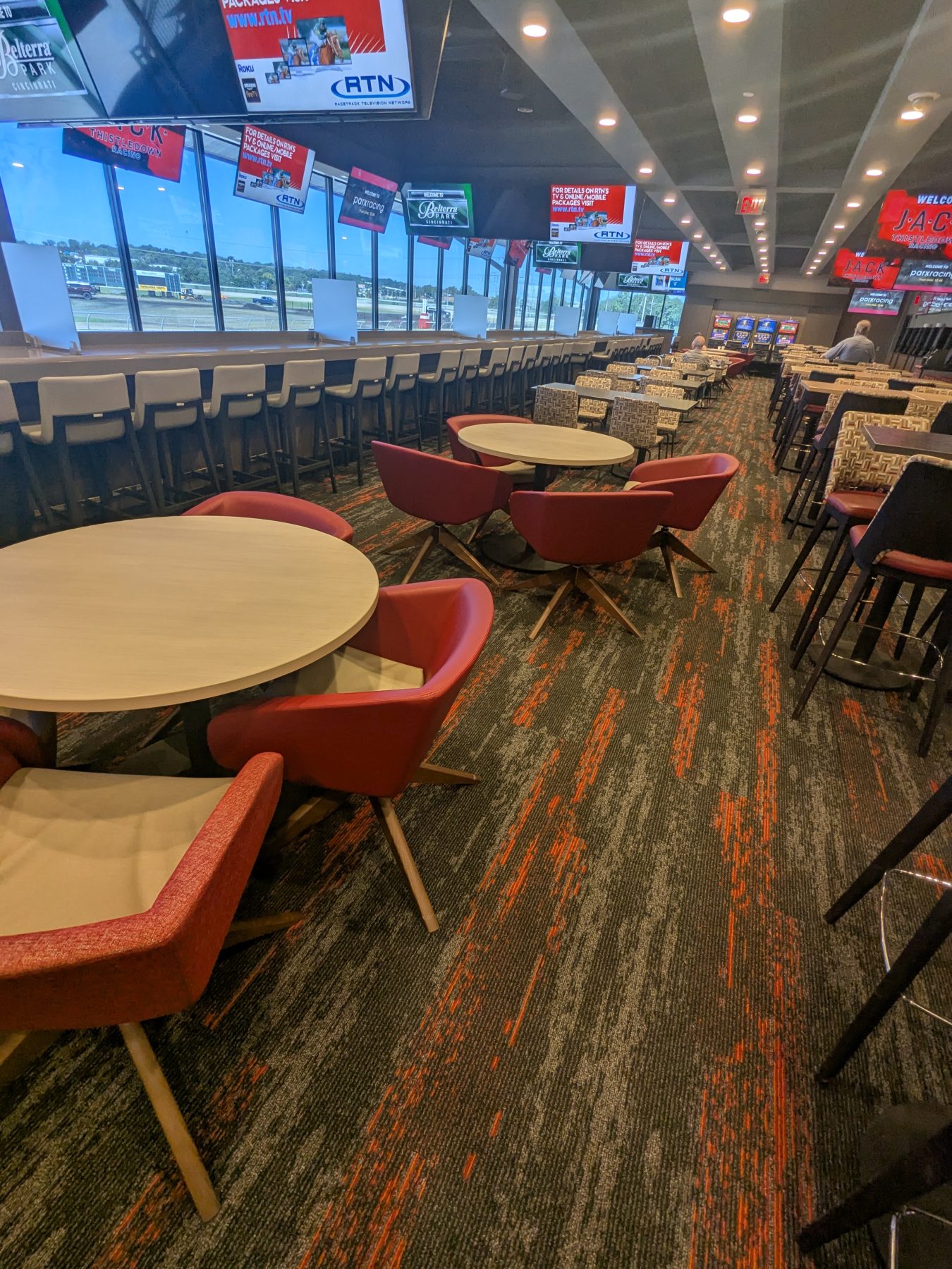 The space is long and rectangular, with rows of seating that provide clear sightlines to the numerous screens. Oversized chairs are arranged for comfort during long betting sessions, and additional seating is available throughout the racing areas during live events. The layout prioritizes functionality, allowing easy movement between betting windows, kiosks, and viewing areas.