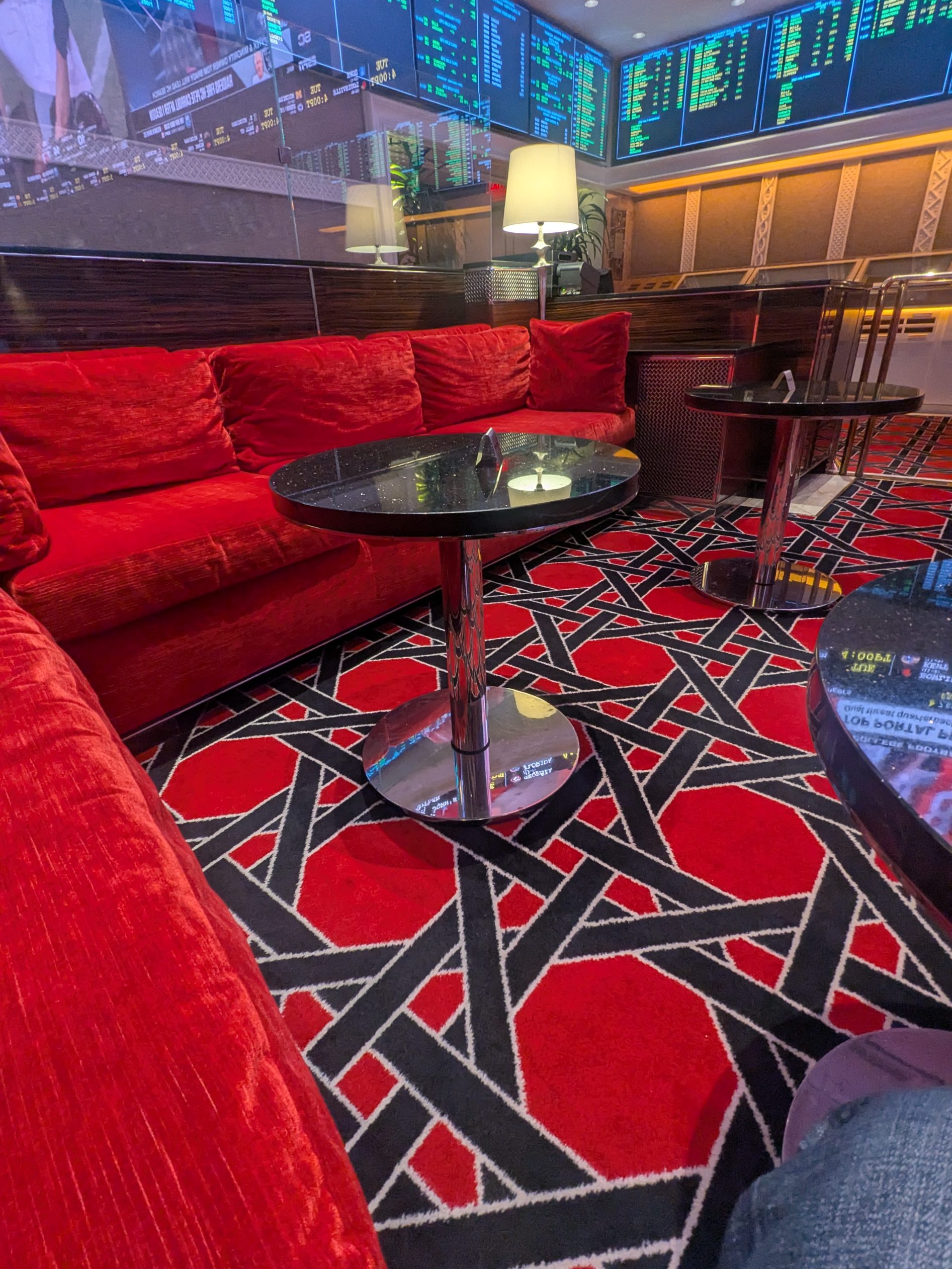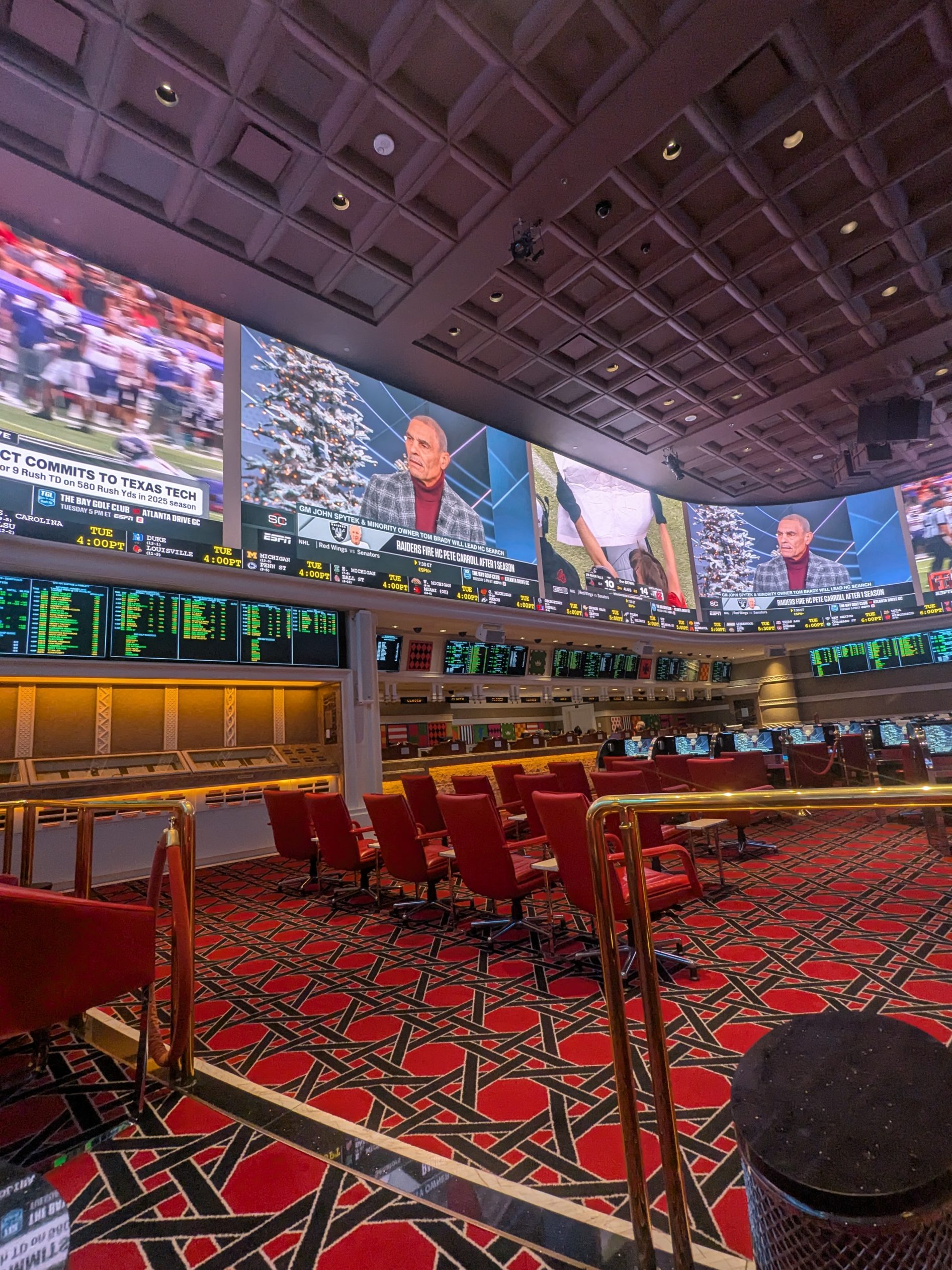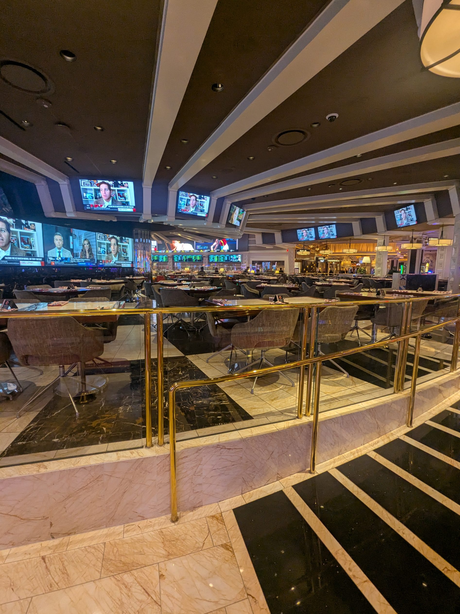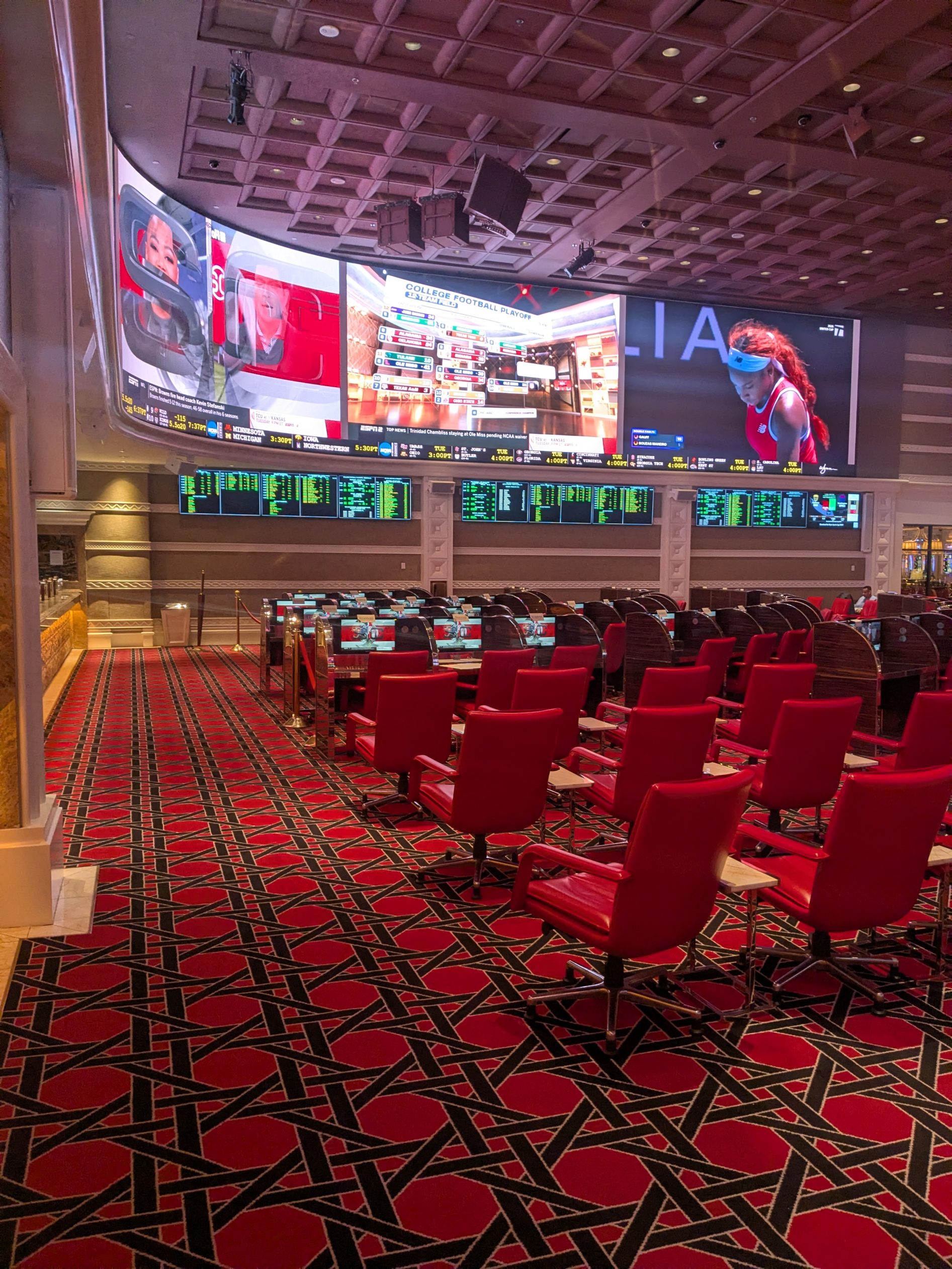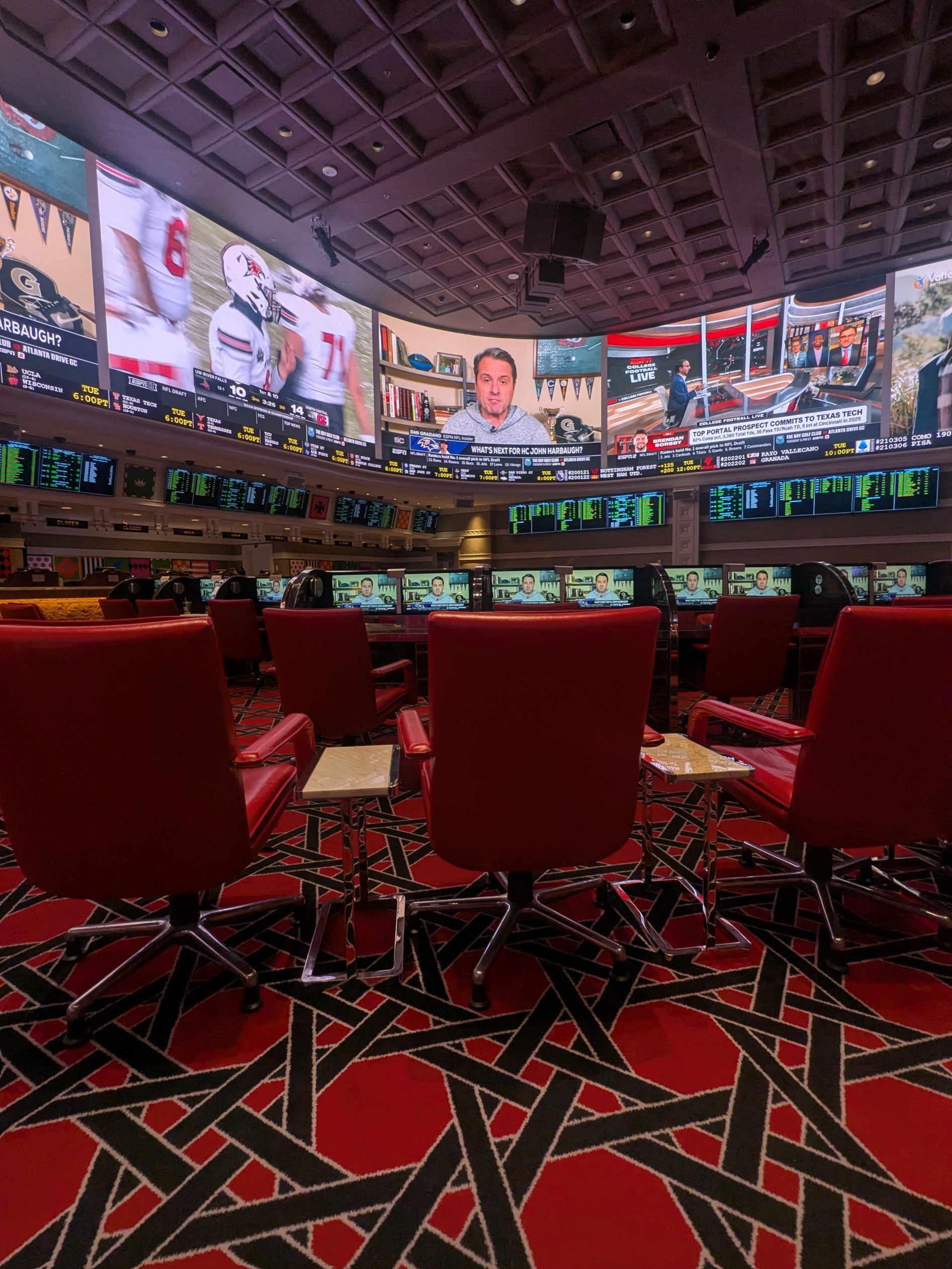 A nearly 1,600-square-foot wraparound LED video wall serves as the centerpiece of the sportsbook and delivers a visually impressive viewing experience. While it may not be the largest video display in Las Vegas, it remains among the more sophisticated and immersive setups in the city. Additional screens are distributed throughout the venue, ensuring strong sightlines across most seating areas and supporting simultaneous viewing of multiple events.