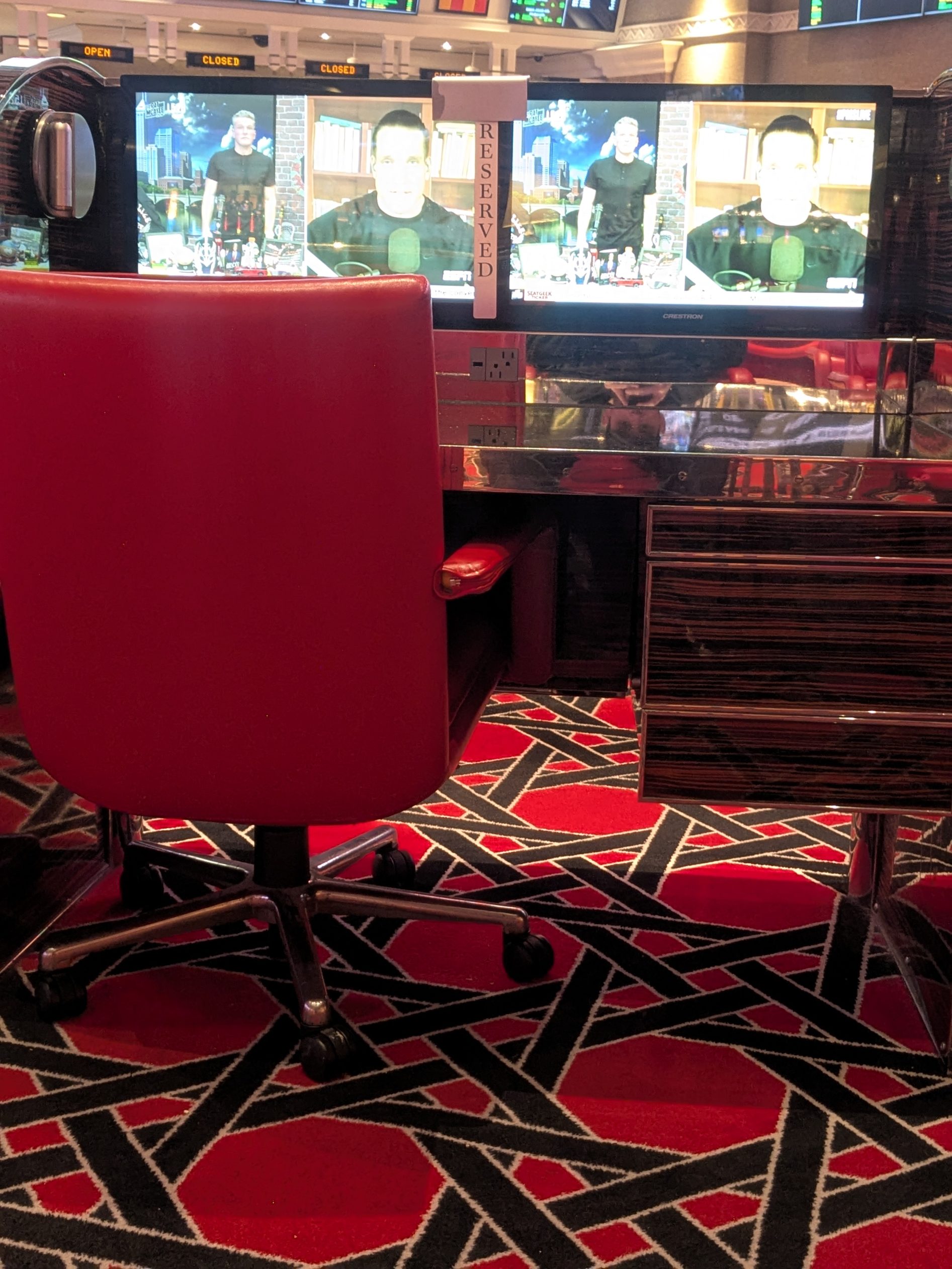 Food and beverage service is anchored by Charlie’s Sports Bar, which is directly connected to the sportsbook. The restaurant offers an elevated take on classic sports bar fare, including burgers, sandwiches, appetizers, and a full beverage selection featuring draft beers, craft brews, and specialty drinks. Guests can bring food from Charlie’s or other Wynn dining venues into the sportsbook. While food access is convenient and varied, service is generally centered around ordering from nearby outlets rather than fully integrated in-seat ordering systems.